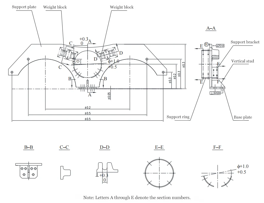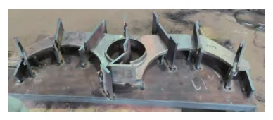 (3) Place the machined base plate firmly on the machine table and, using the table as a reference, machine the contours of the support plate, the inner and outer circles of the support ring and support arc plate, the contour dimensions of the load-bearing blocks, and the holes on the support plate;