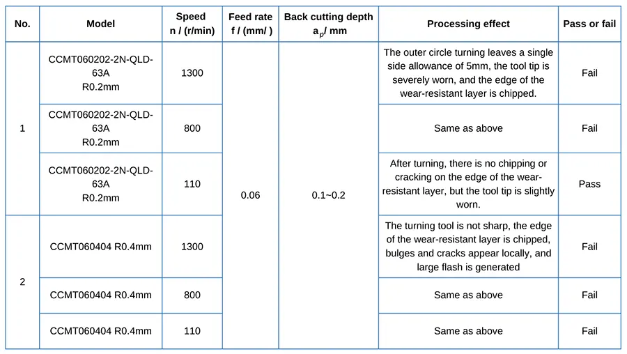 Table 1 shows that both CBN insert models, CCMT060202-2N-QLD-63A and CCMT060404, were tested using identical cutting parameters.